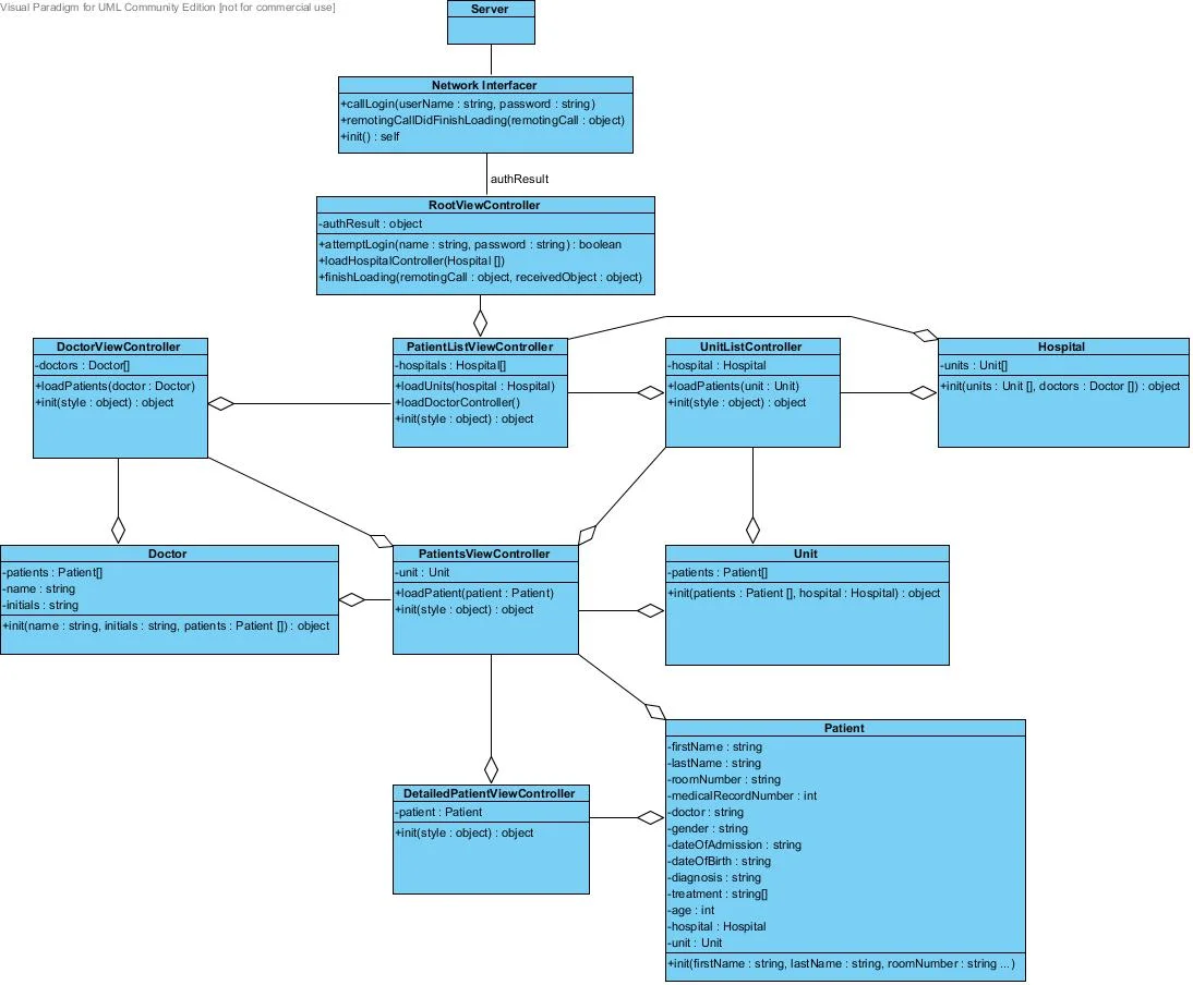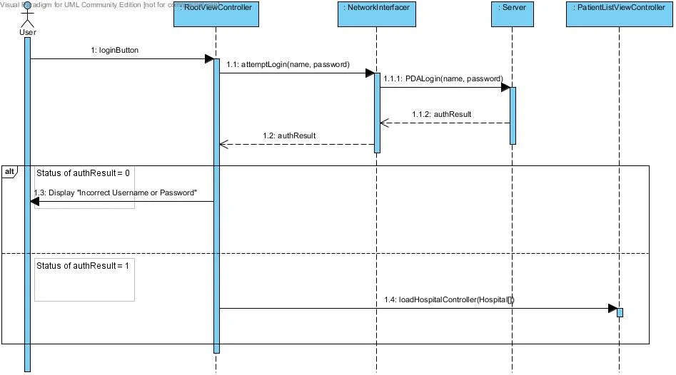 UML class and flow diagrams describing the system architecture, login and usage flows